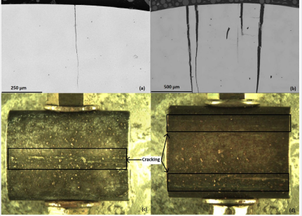 Figure 6.Cracking av C-rings vid 800 MPa med en 5 | j, g/cm2/h avsättning flussmedel och en testgas av luft - 300 vppm SO2(a) 100 h exponering tvärsnitt (b) 300 h exponering tvärsnitt (c ) 300 h centrala krackning (d) 500 h symmetrisk sprickbildning.